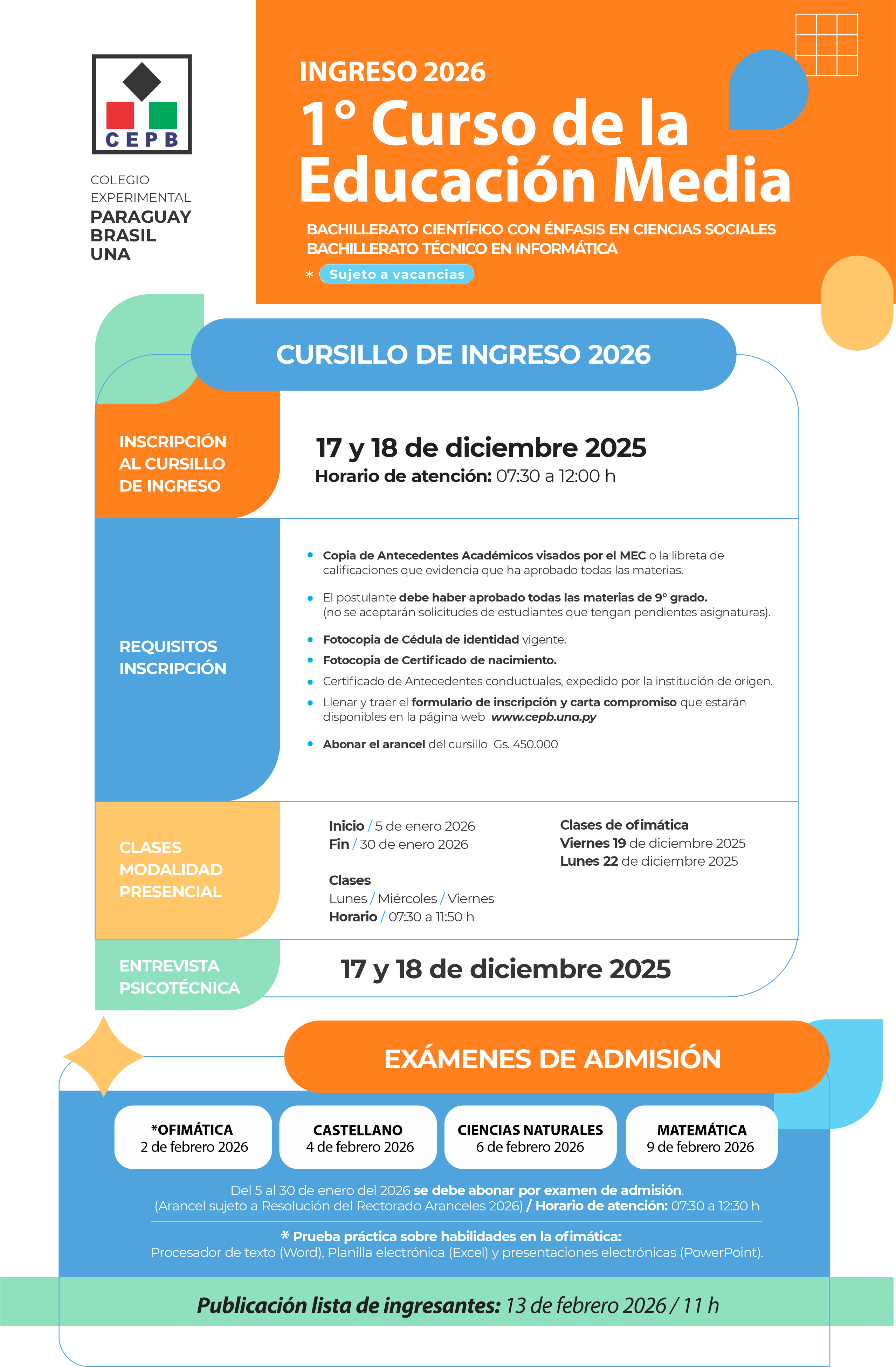 Ingreso al 1º Curso de la Educación Media Descargar Formulario de Inscripción y Carta de Compromiso 2026 Descargar Programas para Postulantes al Primero de la Educación Media 2026 < PrevioSiguiente >