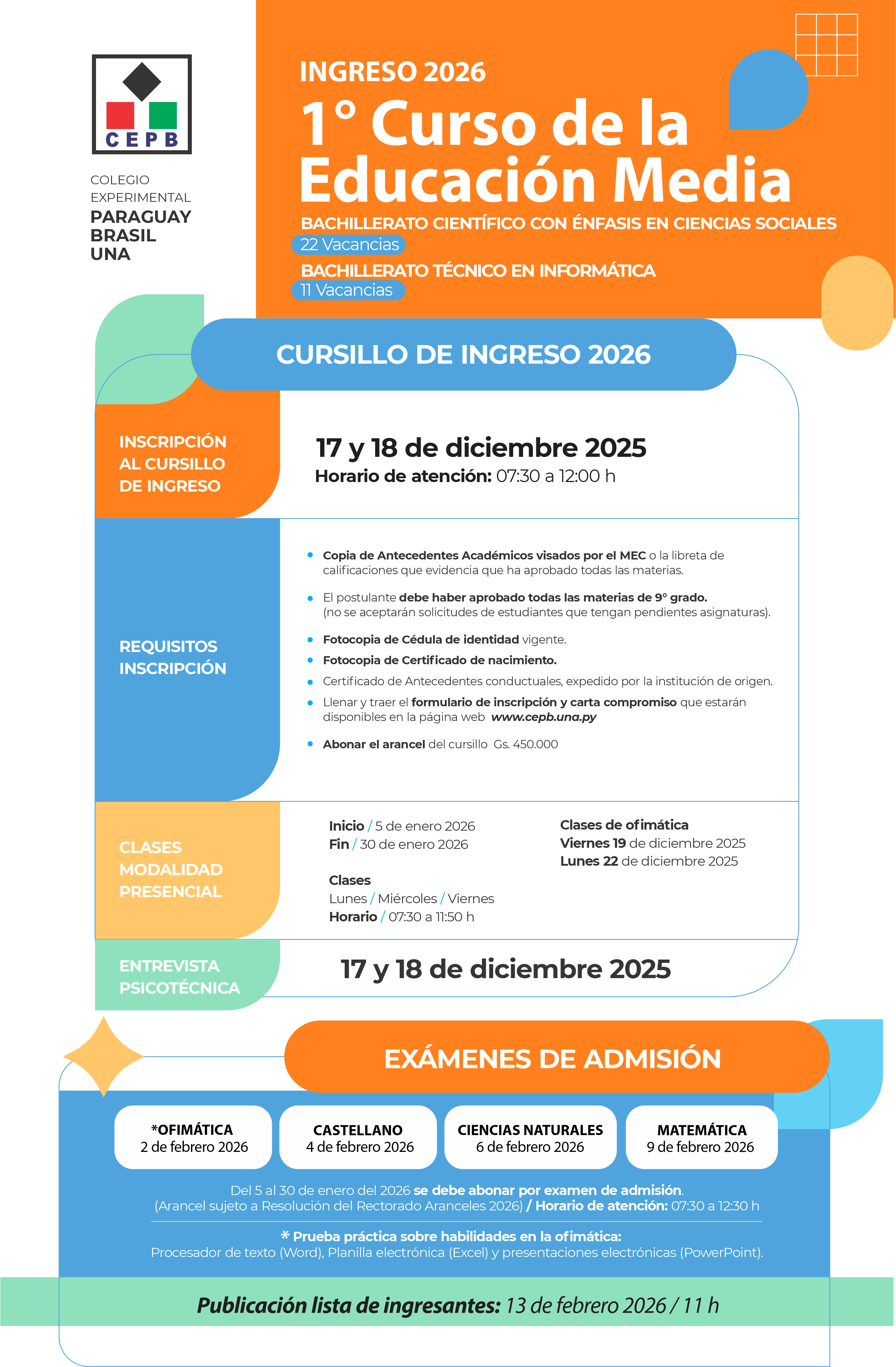Ingreso al 1º Curso de la Educación Media Descargar Formulario de Inscripción y Carta de Compromiso 2026 Descargar Programas para Postulantes al Primero de la Educación Media 2026 < PrevioSiguiente >